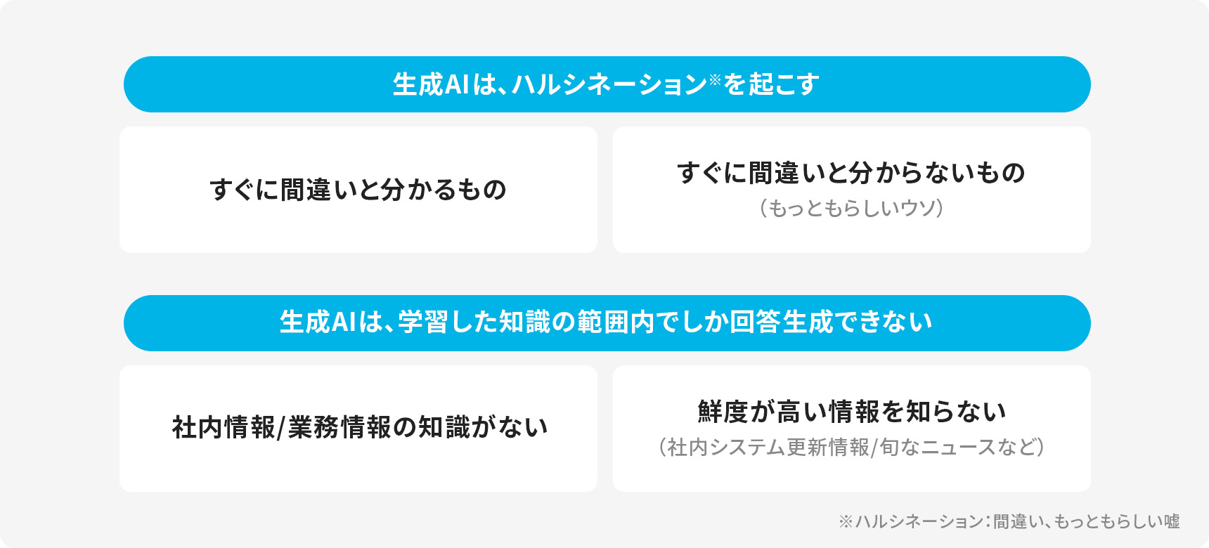 生成AIが事実とは異なることをあたかも正しいかのように生成する現象は、人から見てAIが「幻覚を見ている」ように思えるためハルシネーションと呼んでいます。