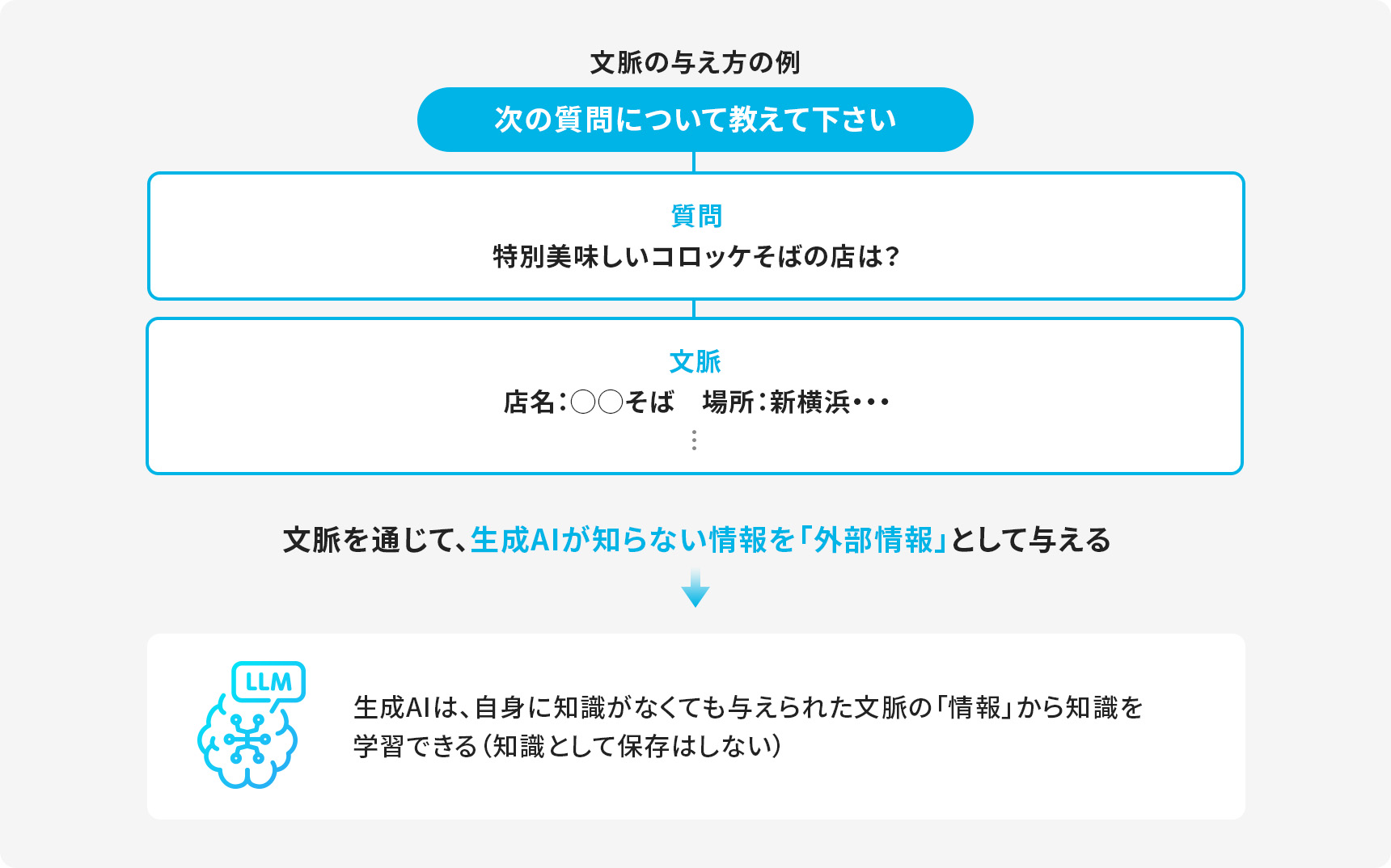 プロンプトに質問と質問に関連する情報を「文脈」として書き込んで生成AIに与える