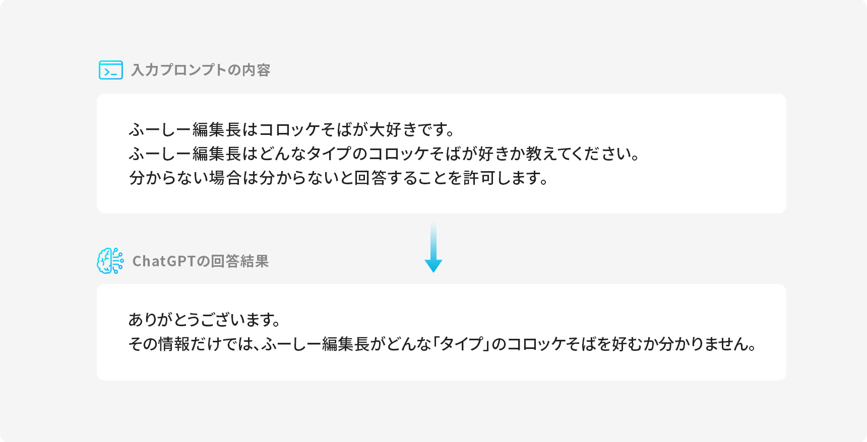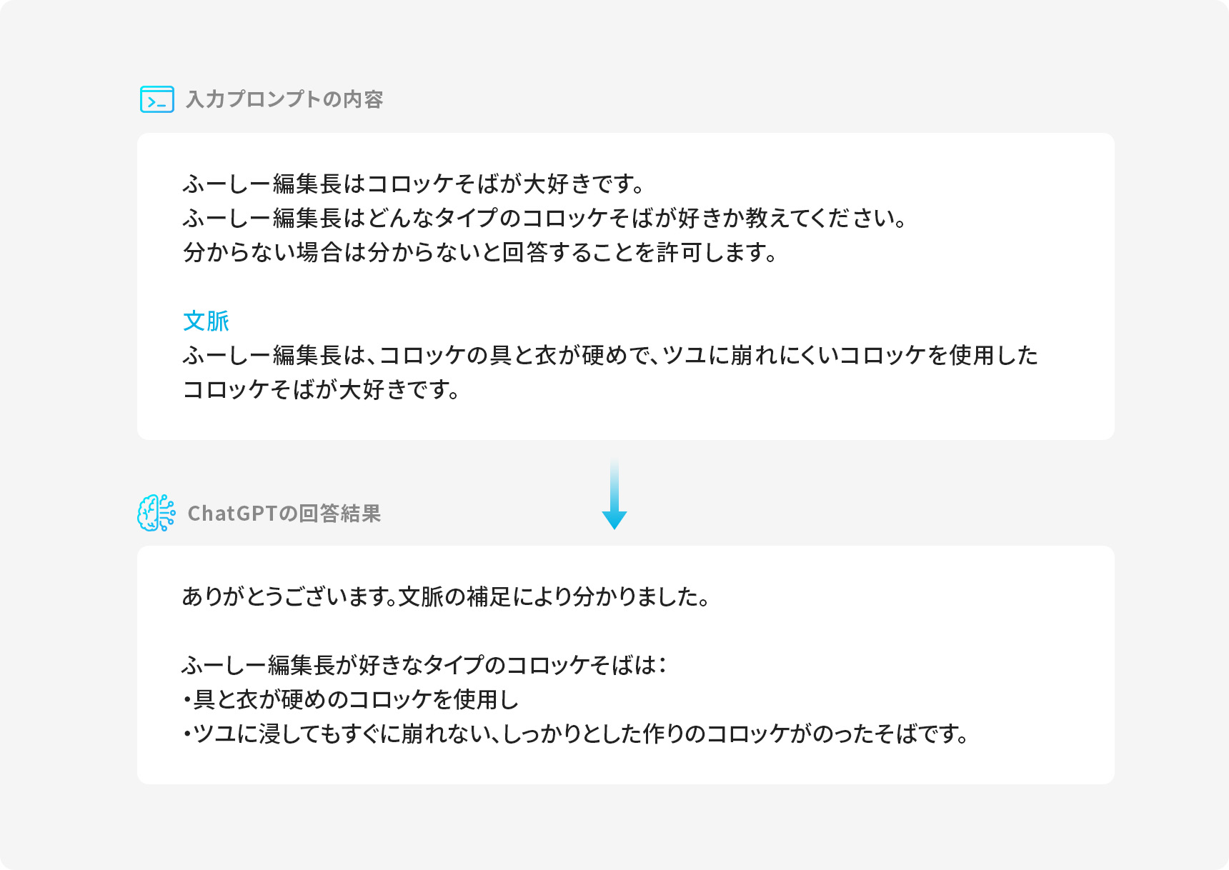 現実的には、このように自分への質問に外部情報として文脈を与える、ということはありませんよね。