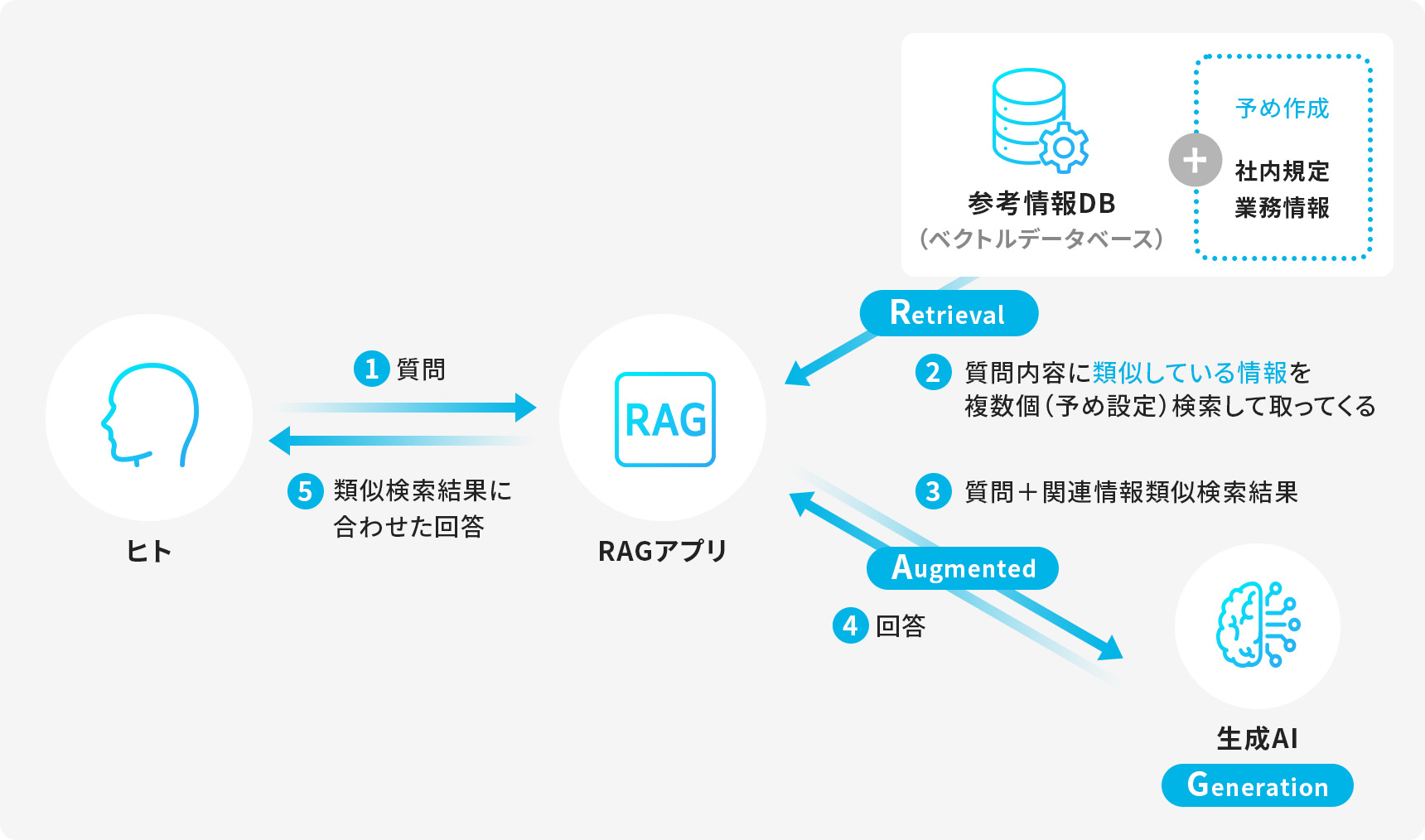 - 質問に類似した情報を参考情報DBから検索して、結果を生成AIに与えて文脈学習をさせる